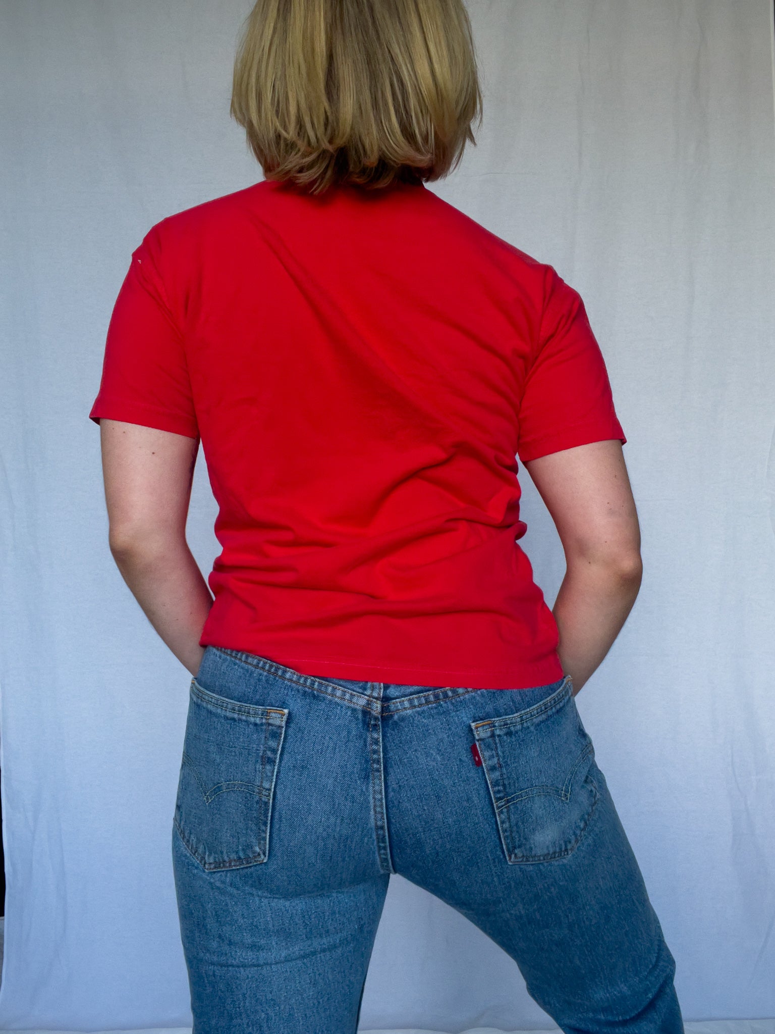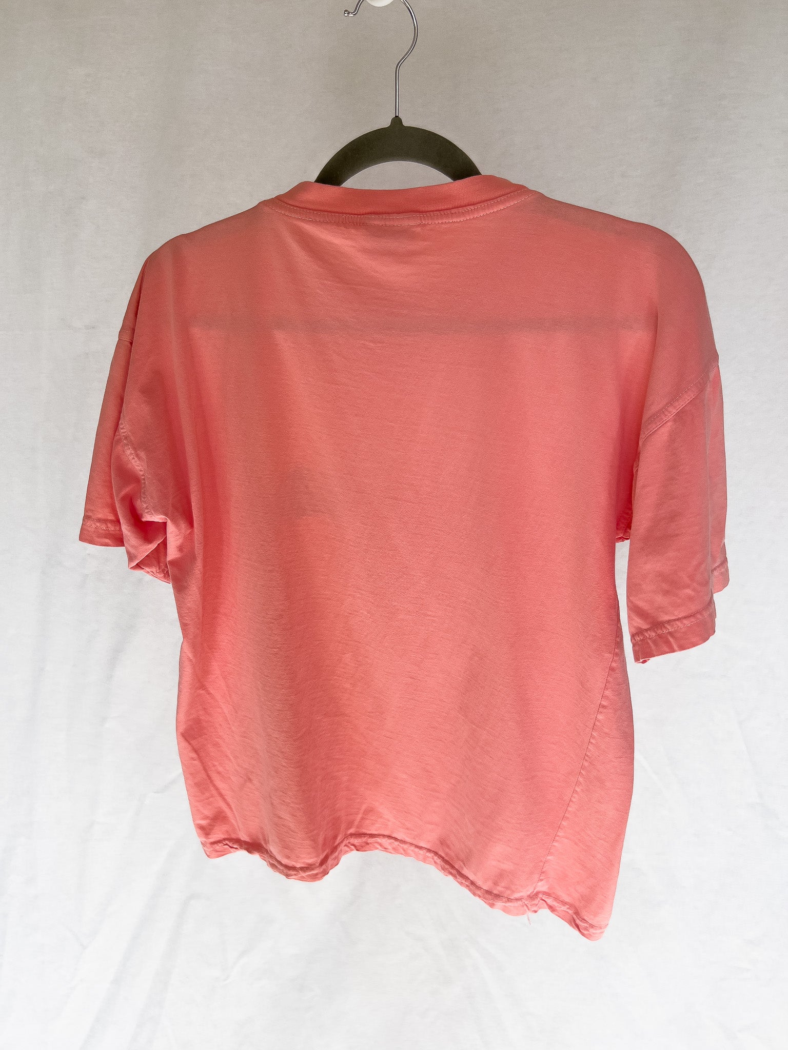 Two shirts available in red and pink. Pink shirt has small marking/stain.