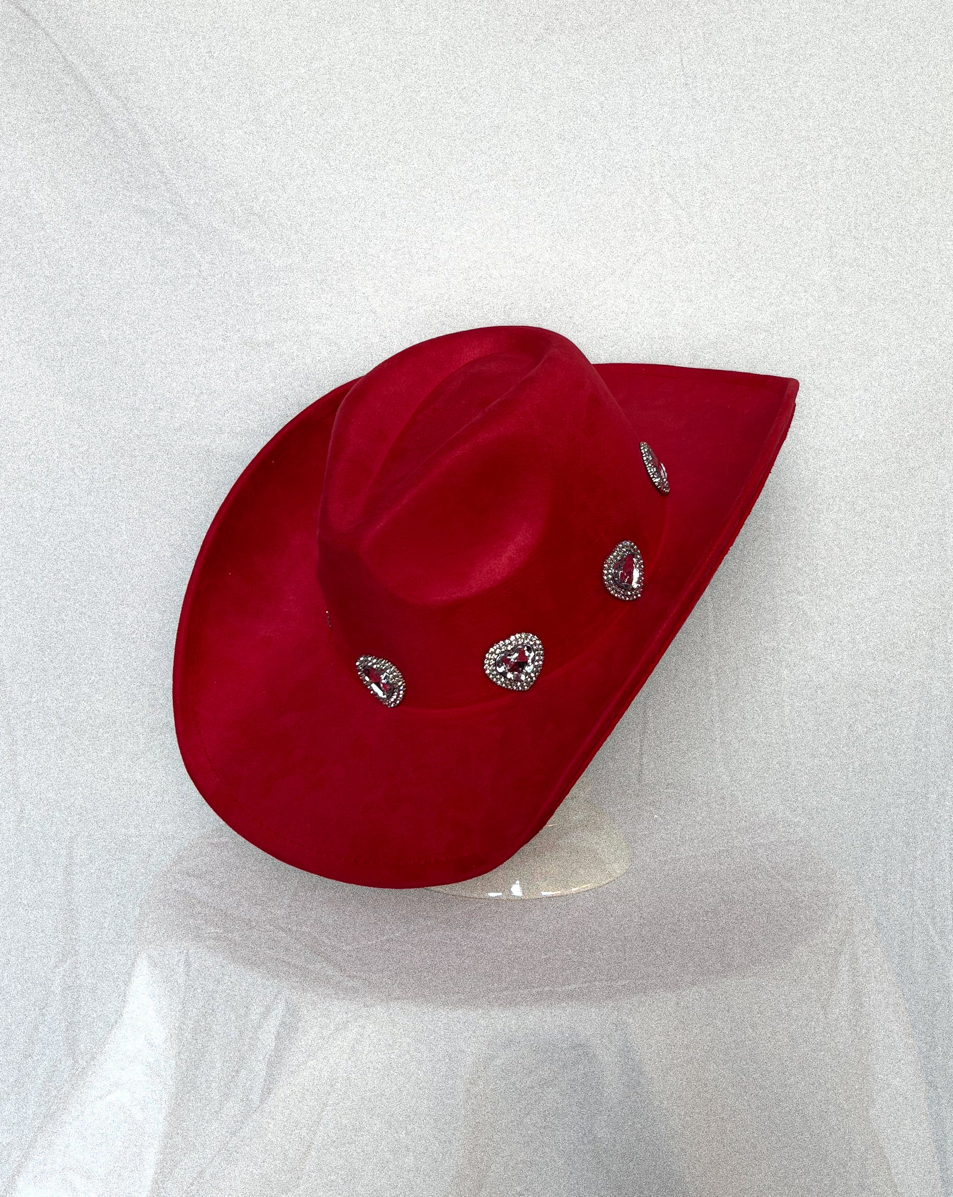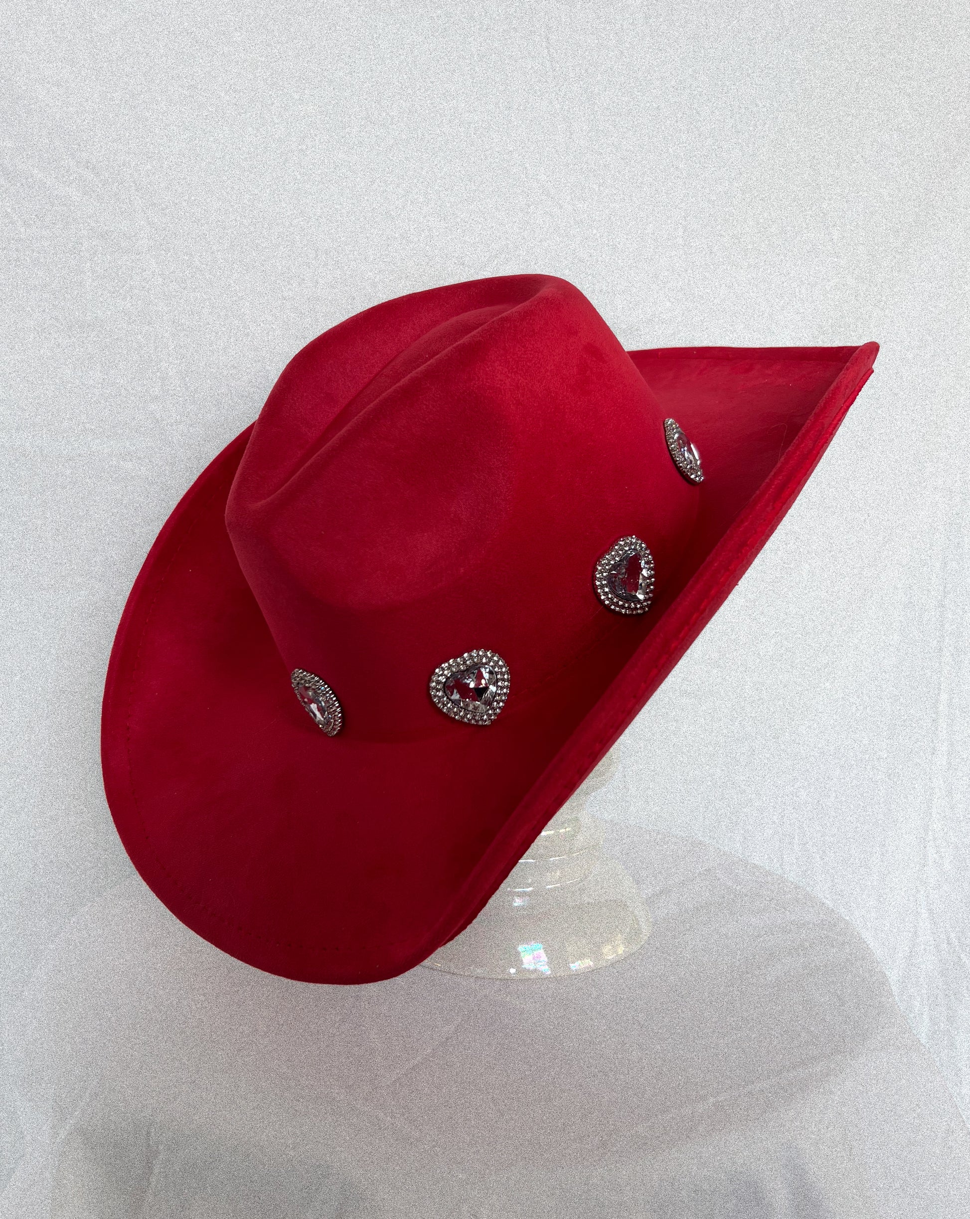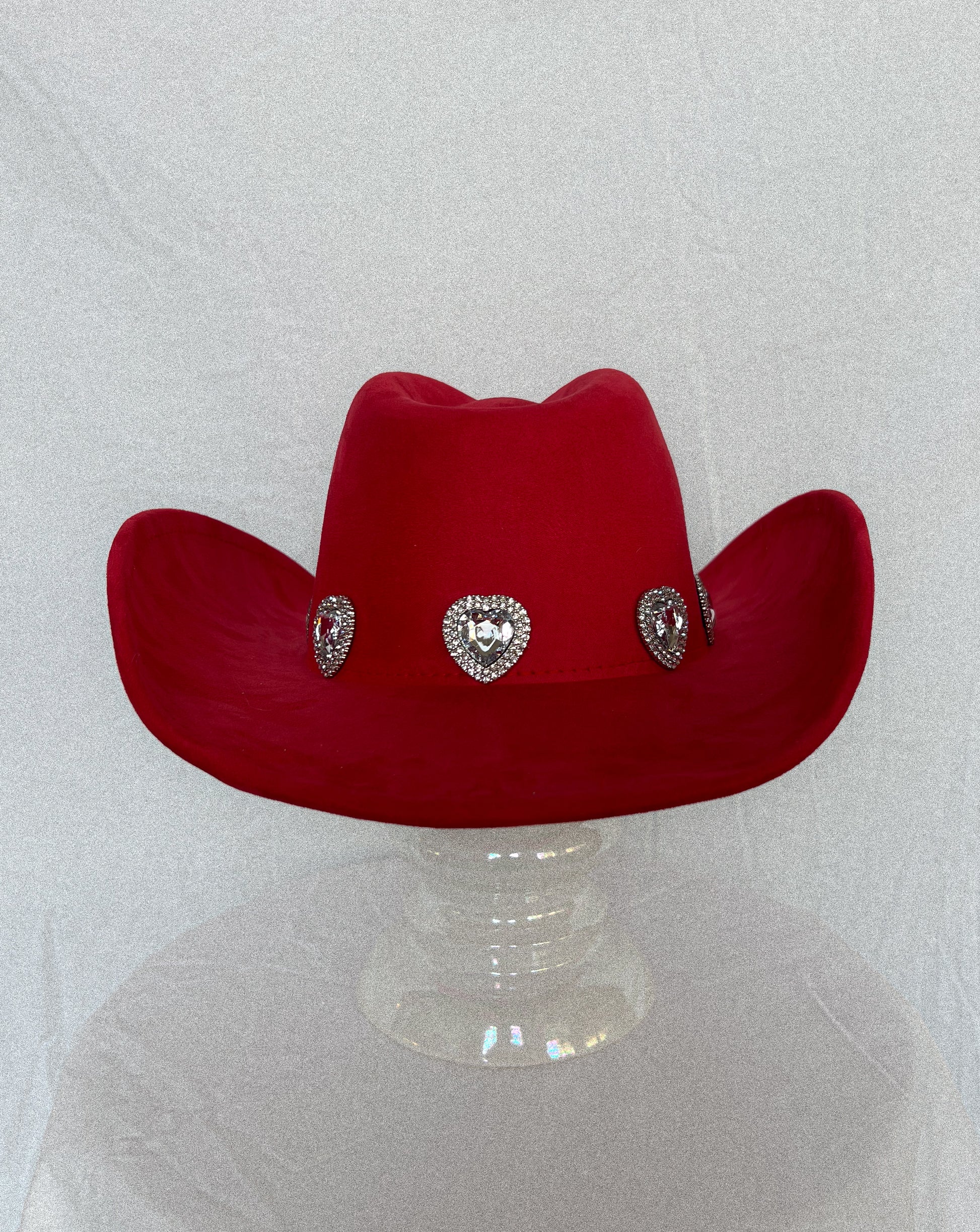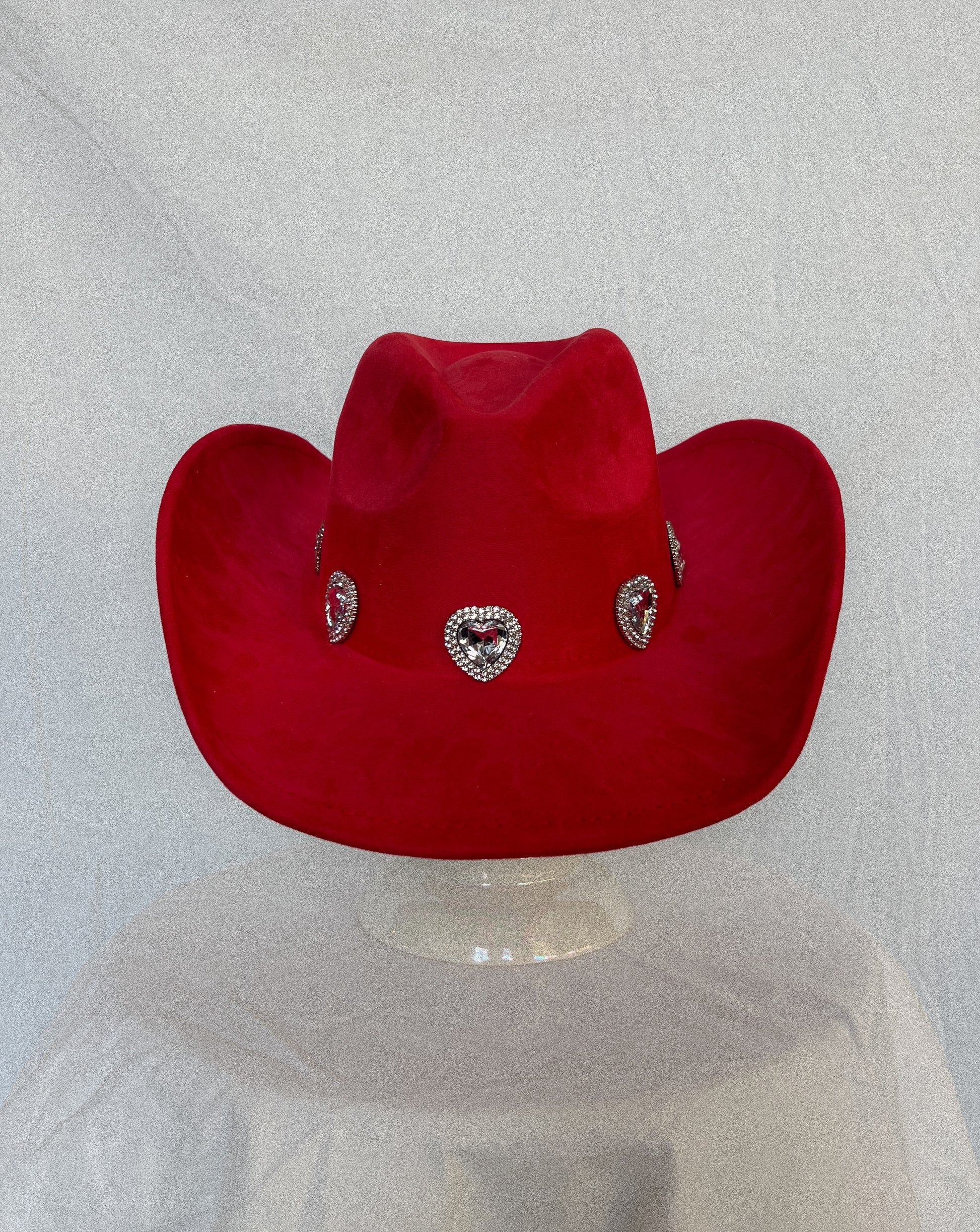 Solid red cowboy hat with rhinestone heart embellishments wrapped around the head.