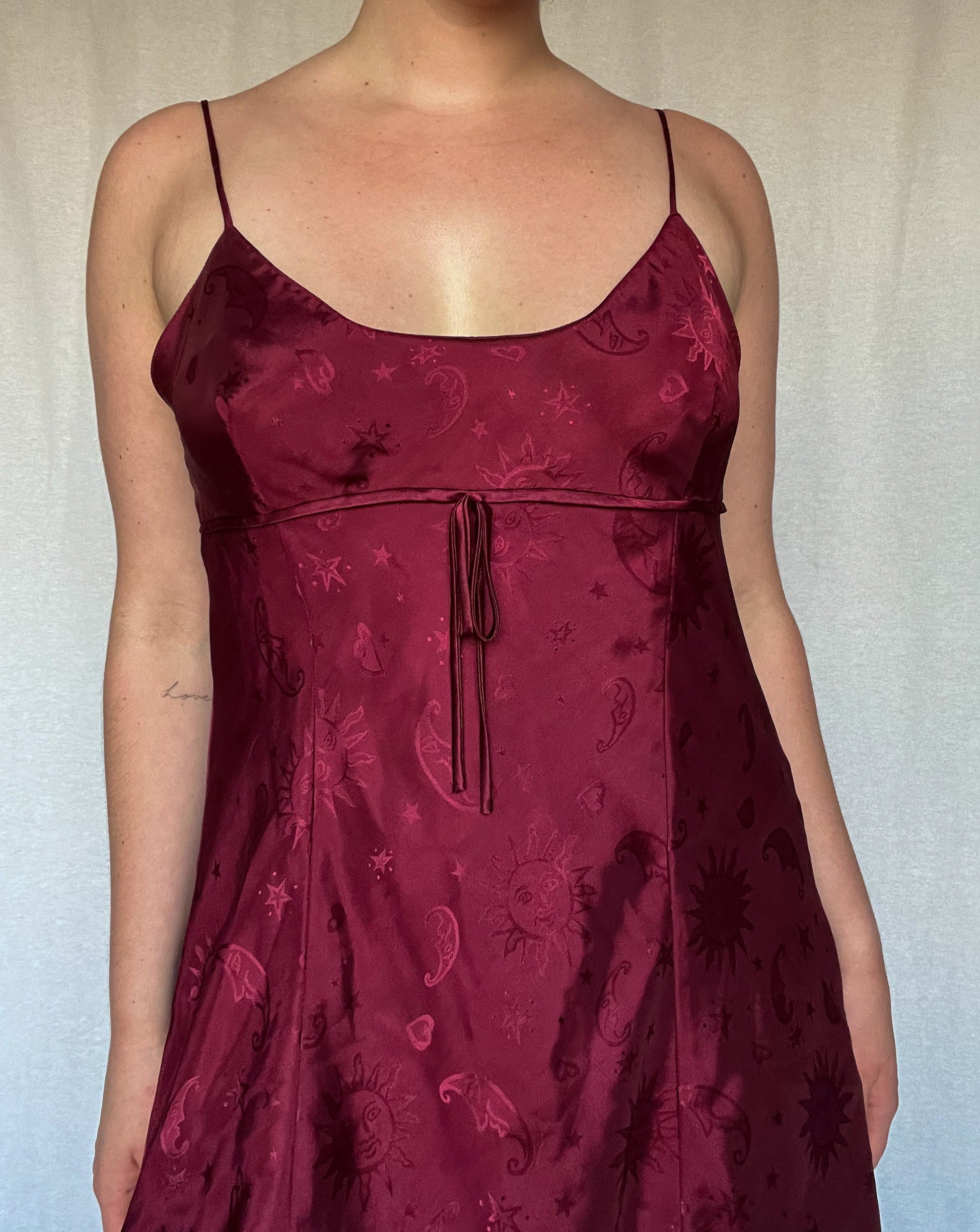 Burgundy satin, baby doll slip dress with sun, moon, and star patterned fabric. Spaghetti straps, adjustable.