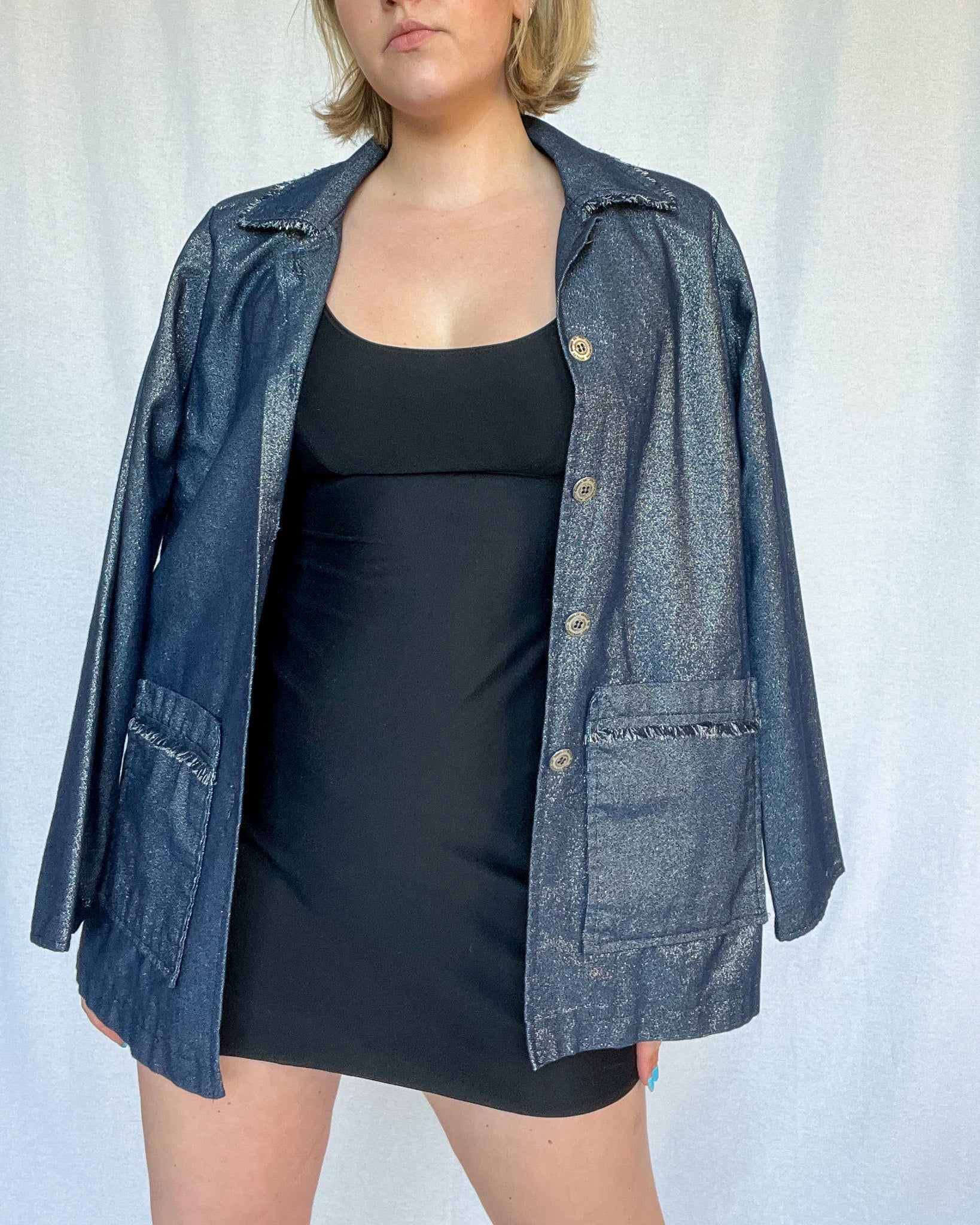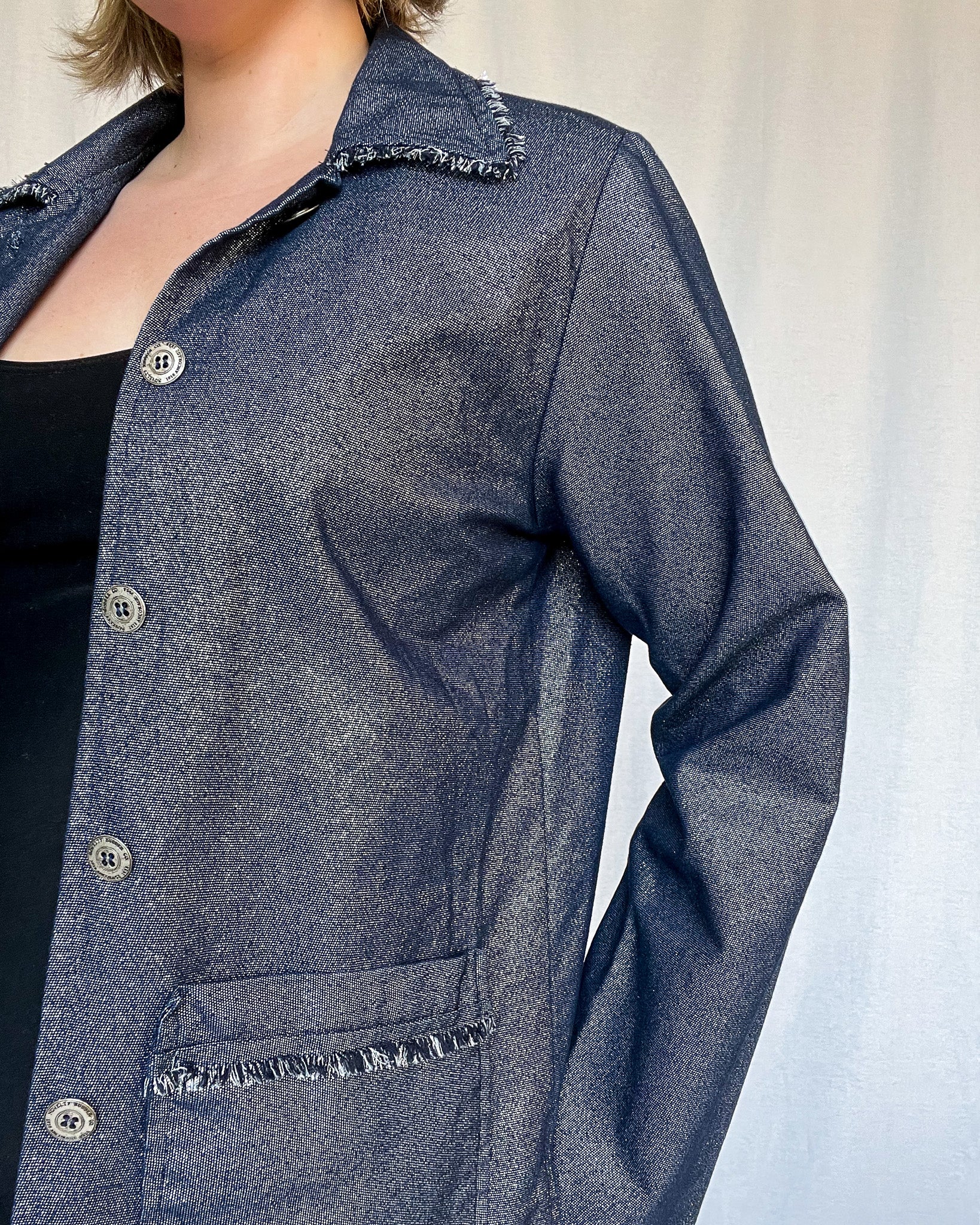 Oversized, dark blue, sparkly faux denim blazer with fringe trimming. |