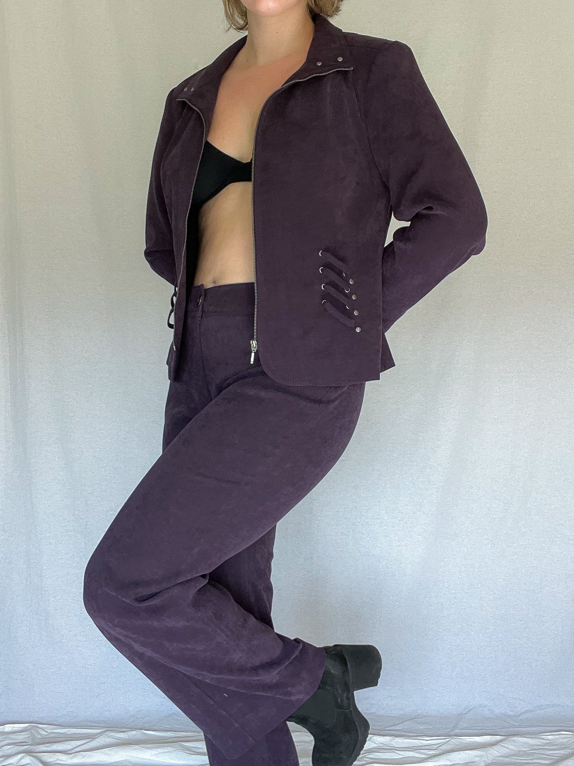Wide leg, mid-rise pants with matching zip-up, collared jacket. Dark purple, suede like fabric.