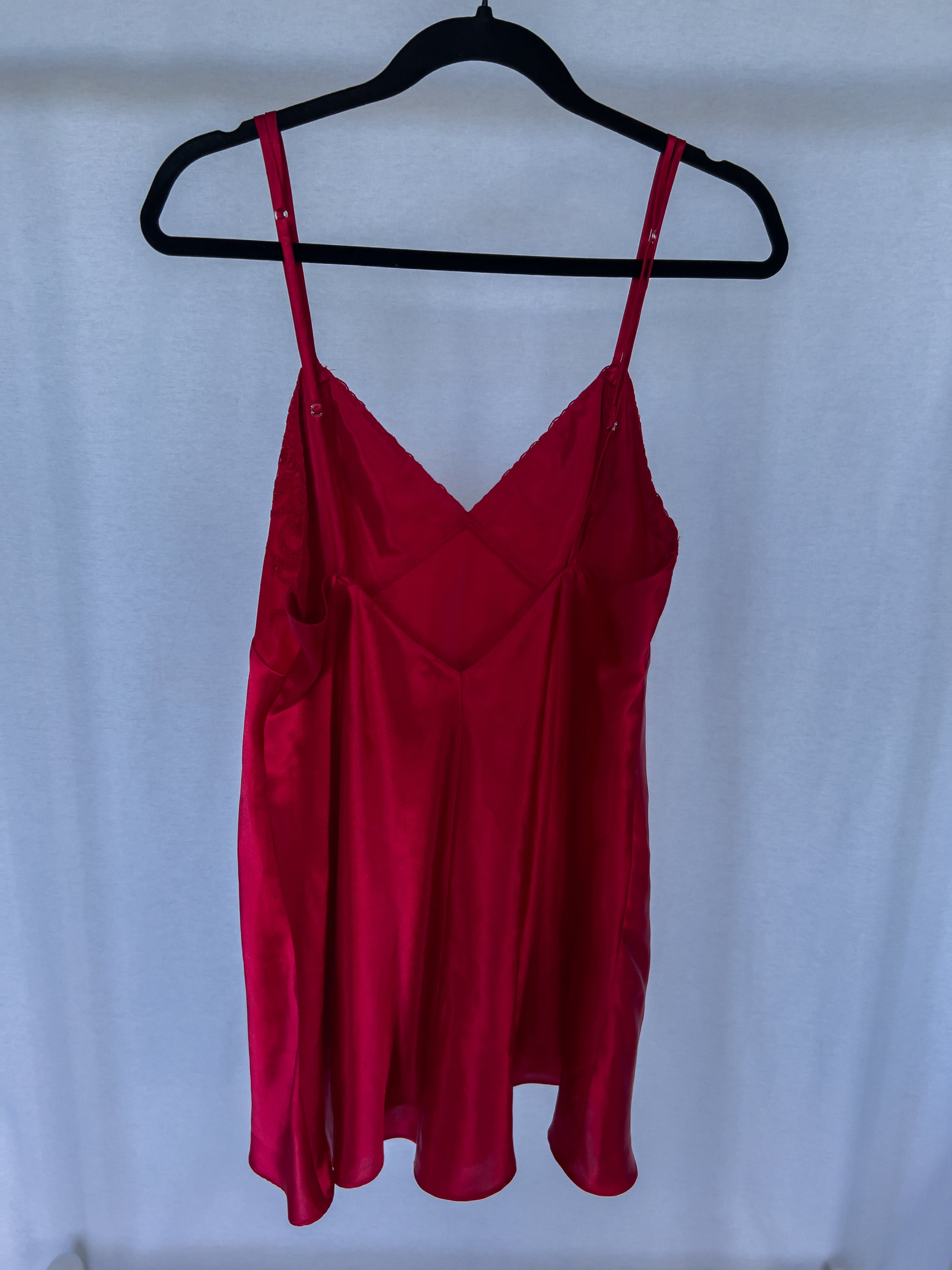 Satin, spaghetti straps, lace trimming around the neckline, v cut back.