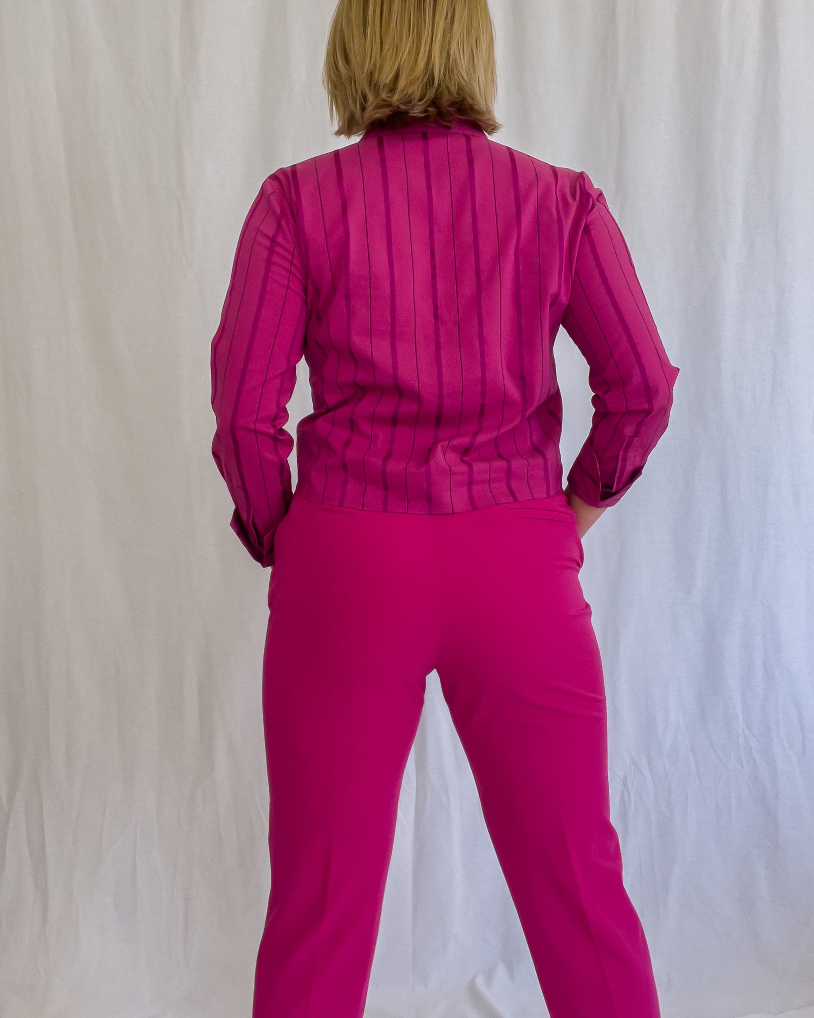 Fuchsia button-up long sleeve dress shirt with alternating pink stripes. This shirt is shorter than most dress shirt styles.
