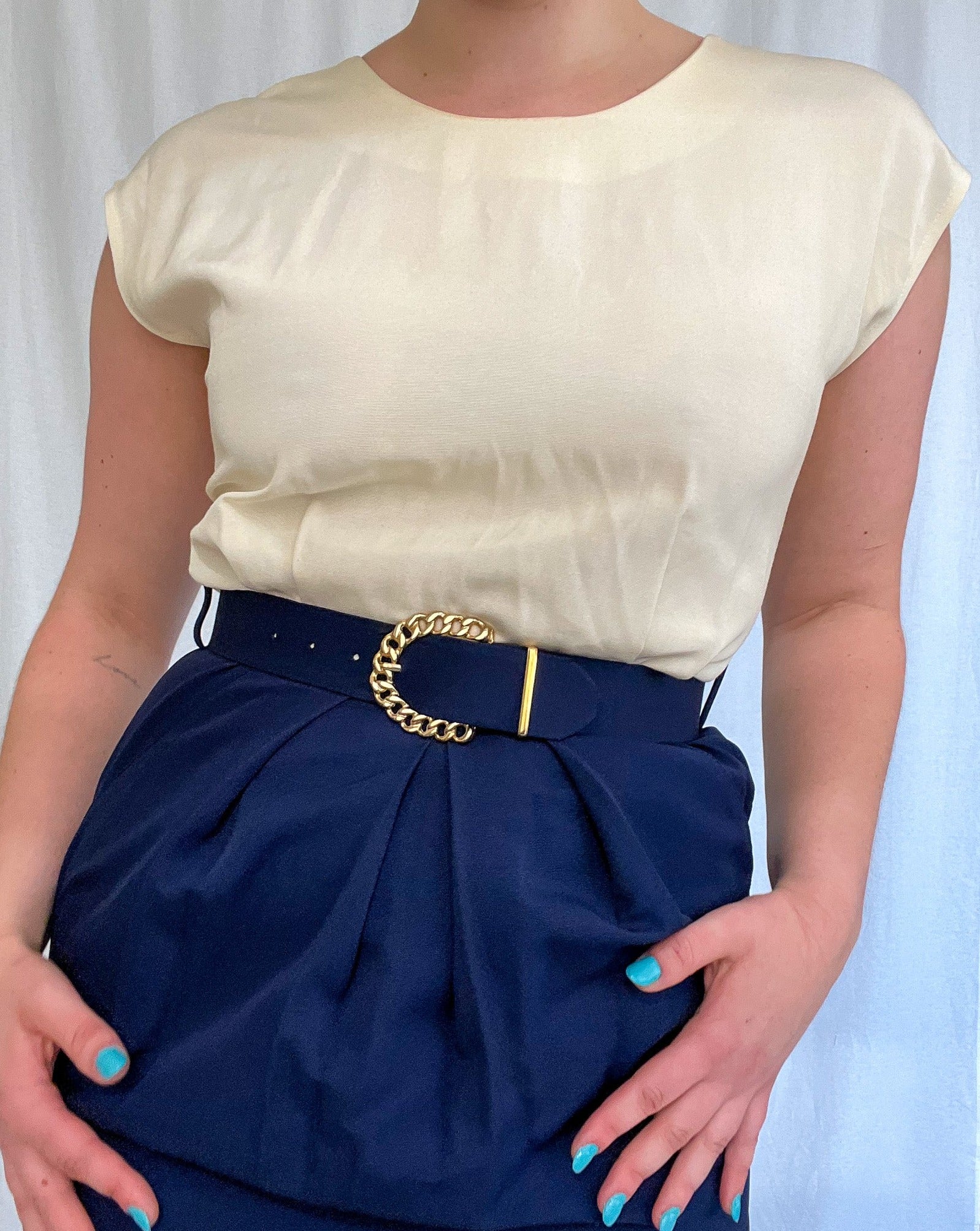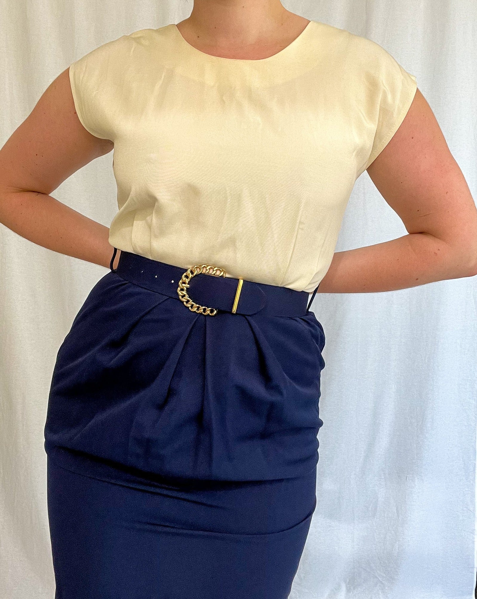 Vintage navy and white dress with matching belt and blazer jacket. The belt has a thick band and gold, chain linked buckle. The blazer jacket is mid length with 3/4 length sleeves, shoulder pads, and navy embroidery of waves along the jacket shoulders.